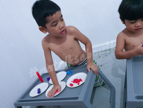 I bought the kinetic sand set from a popup booth few years back but you could find them at Shopee now with more choices and sizes. The one the boys played with today is the small size that I took out since I had to do housekeeping today, because its Sunday.